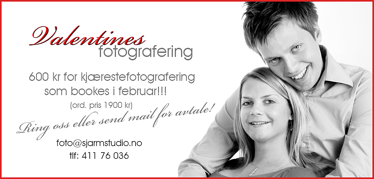 Tradisjonen tro kjører vi også i år vårt Valentinestilbud! Ta med din kjære på en fotografering og skap gode minner og se tilbake på! Det koster 600 kr for fotograferingen. Tilbudet gjelder kun et antrekk, så det er da fint om dere har på det dere skal fotograferes i av klær på forhånd! 🙂 Book time nå i februar og ikke gå glipp av dette tilbudet som vi kjører KUN en gang i året!!